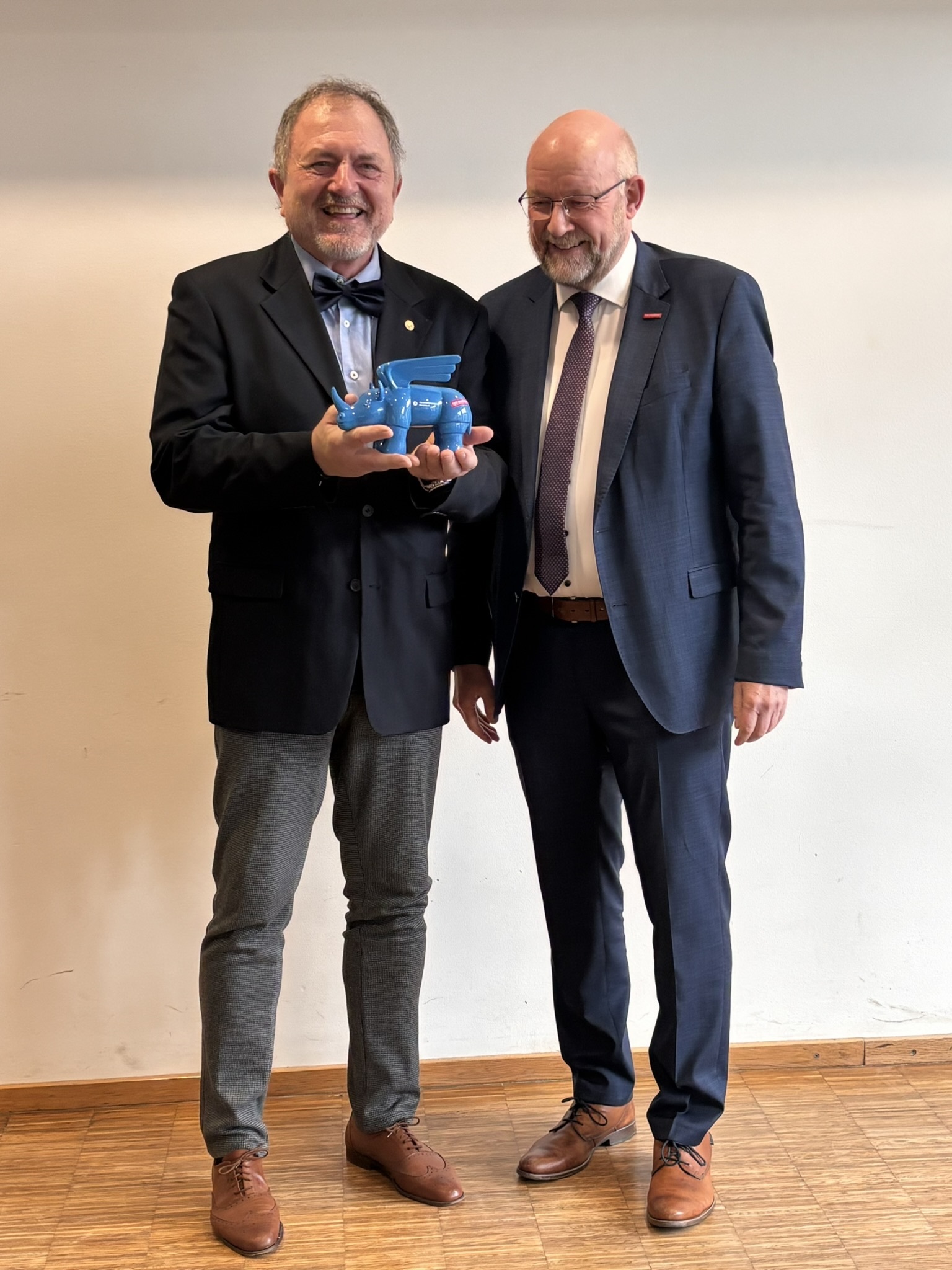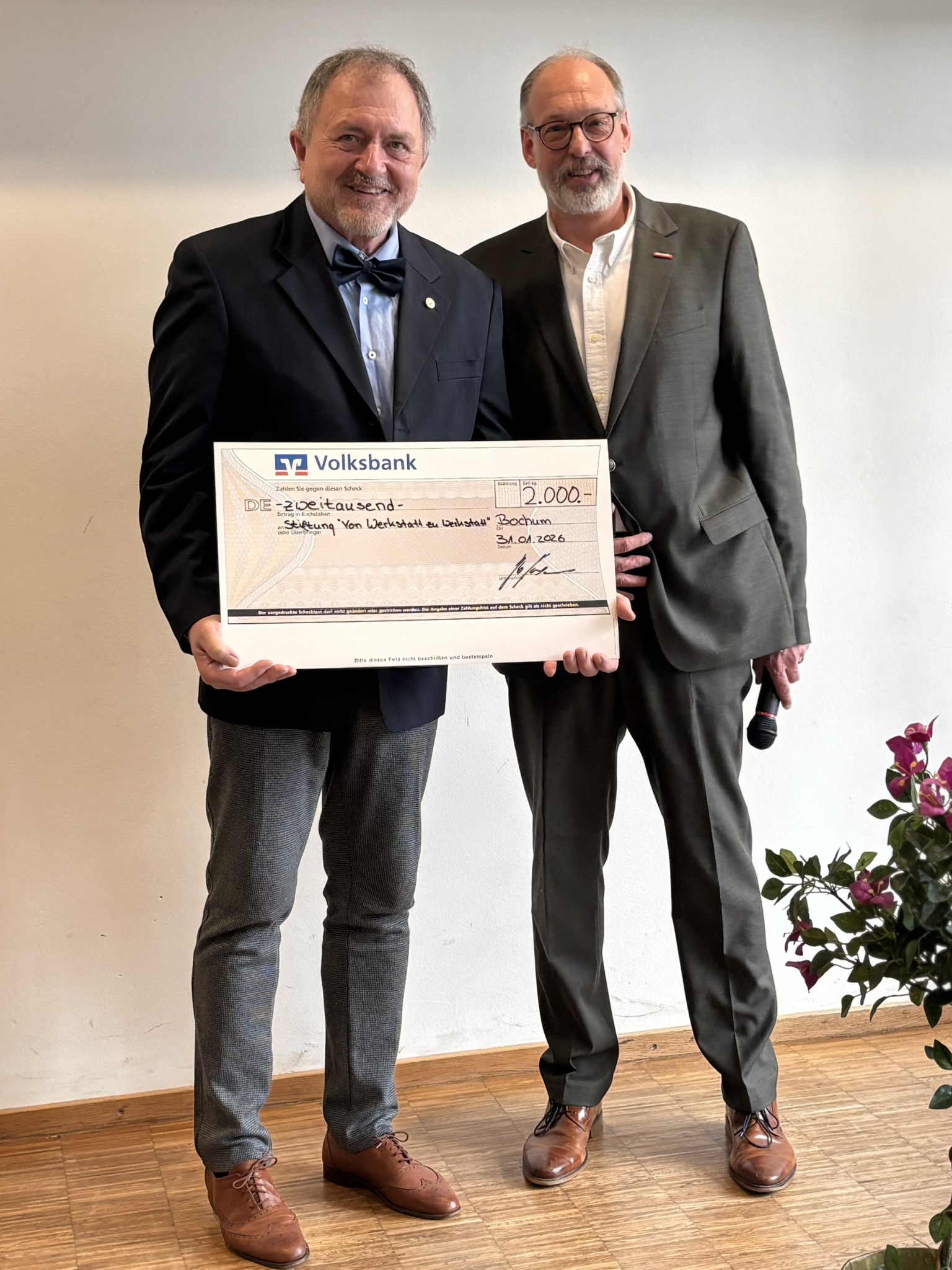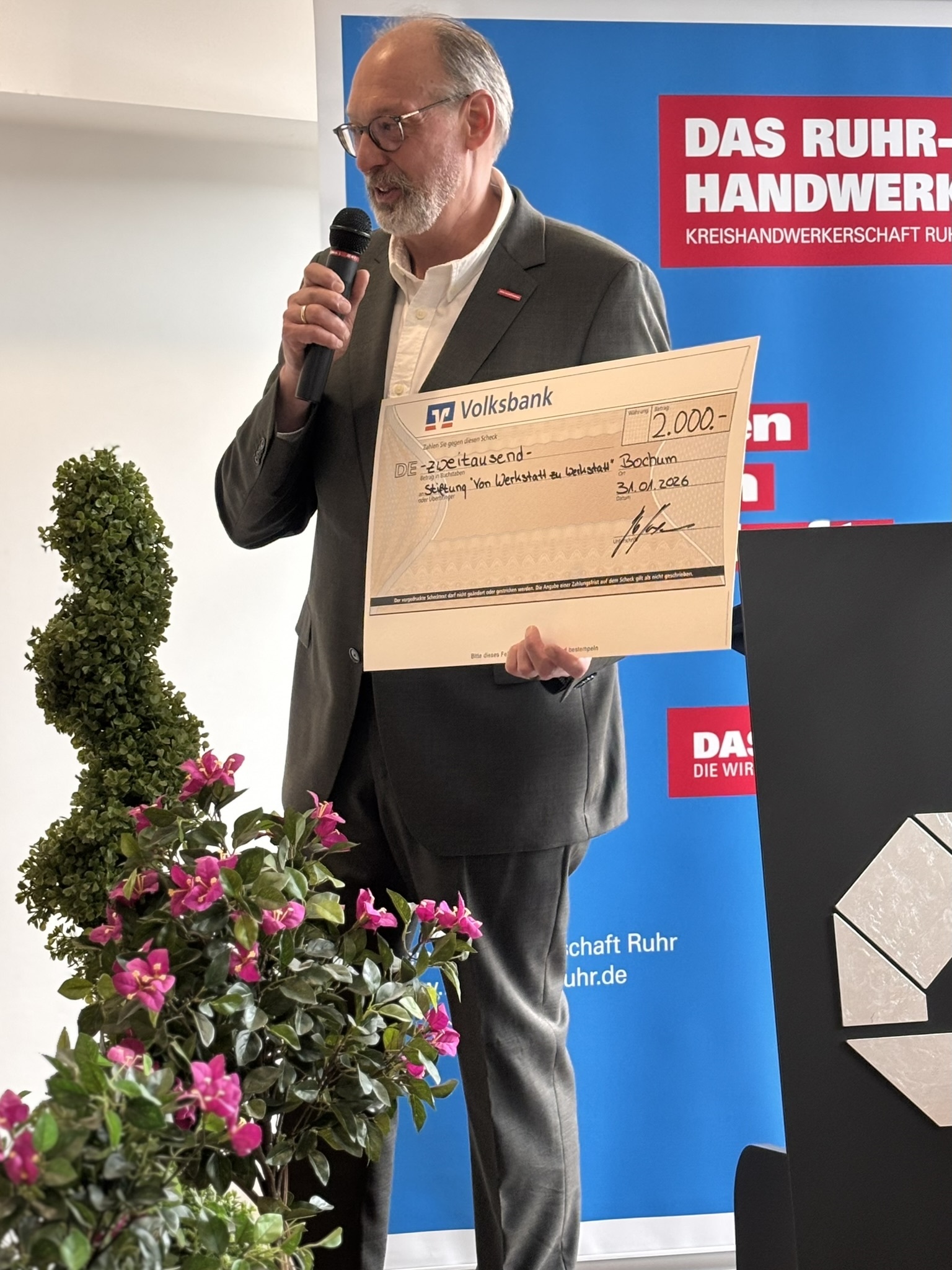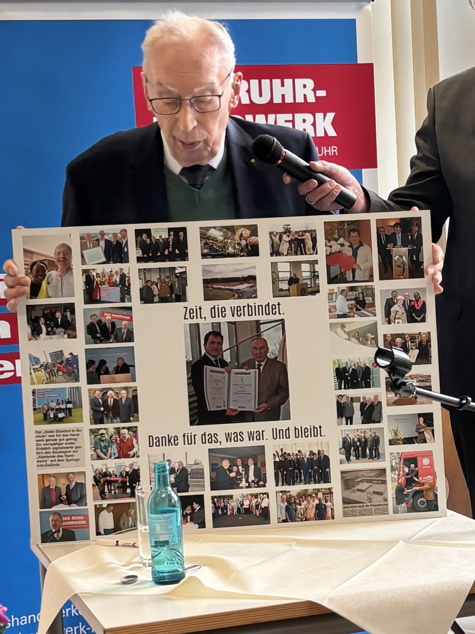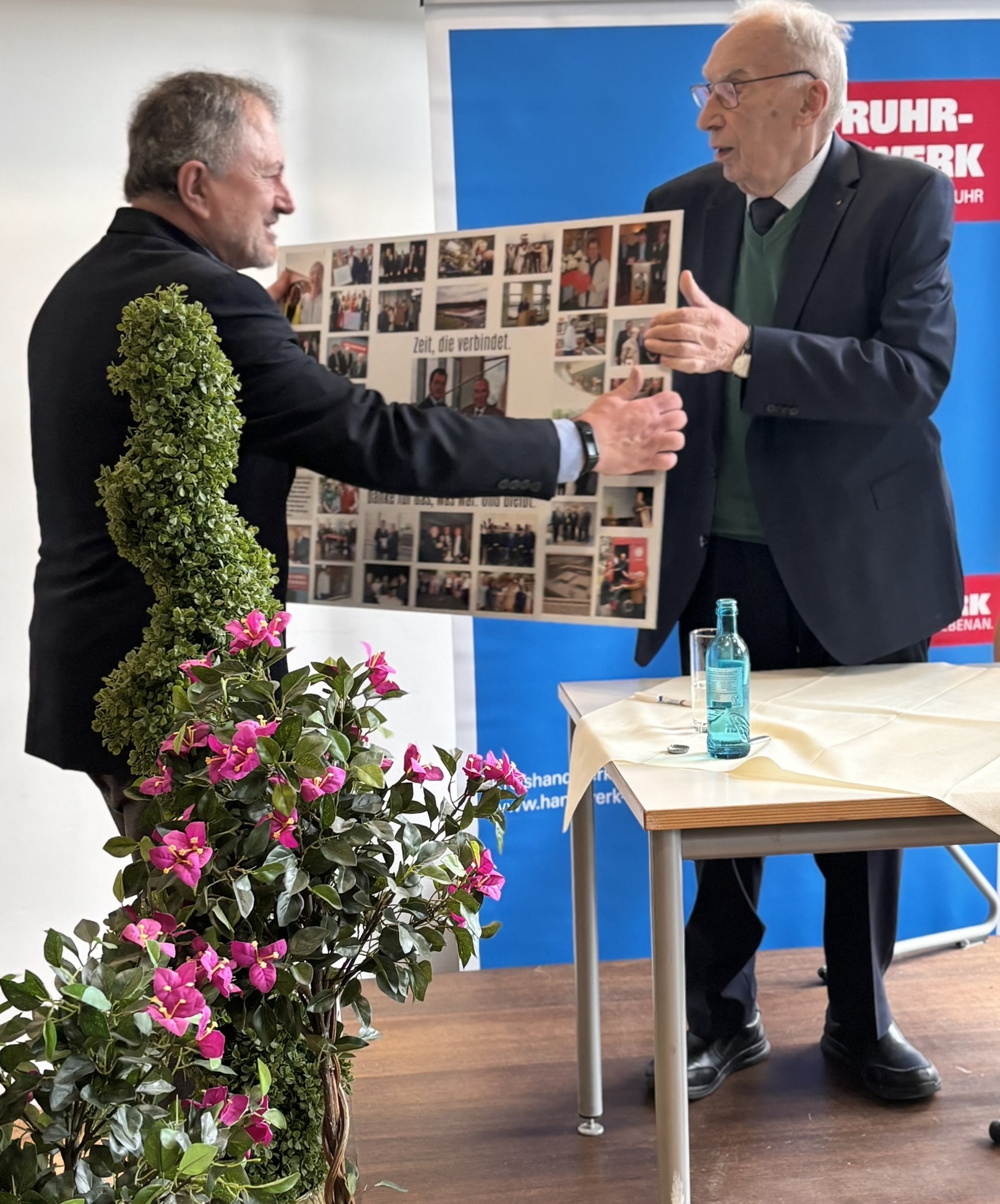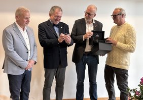 Sodann ergriff Kreishandwerksmeister Wolfgang Hoffmann das Wort und bat zudem seine Kollegen Markus Dürscheidt, Hans-Joachim Drath und Maik Beckmann zu sich nach vorne. "Lieber Johannes, vieles von dem, was du heute erlebst, war im Vorfeld schon lange, sehr lange abgesprochen. Ganz so, wie du es sonst auch gemacht hast. Nur diesmal ohne dich. Der fehlende Geschenkhinweis auf der Einladung hatte einen tiefen Sinn! Eine längst beschlossene Überraschung, ein ausdrücklicher Wunsch aus dem Kreise der Obermeister! Es ist ein gemeinsames Geschenk aller Innungen aus Bochum, Ennepe-Ruhr und Herne, Castrop-Rauxel, Wanne-Eickel. Ein Geschenk, das nicht nur Dank ausdrückt, sondern vor allem das, was du über all die Jahre gelebt hast: Das Wir. Und genau dieses Wir spiegelt sich in diesem gemeinsamen Geschenk wider. Wir haben lange überlegt, was wirklich zu dir passt. Und dabei kam sehr schnell ein Gedanke: Du hattest immer Zeit für uns. Für die Betriebe. Für die Innungen. Für das Handwerk. Aber viel zu selten Zeit für dich selbst. Zeit und Handwerk – das kann eigentlich nur eins bedeuten: Eine Uhr. Eine Uhr mit persönlicher Widmung. Ein ehrliches Dankeschön. Ein Zeichen unserer Wertschätzung. Und eine Erinnerung an eine Zeit, die Spuren hinterlassen hat. Und damit nicht genug: denn auch dein Herzensanliegen, die Arbeit der Stiftung Von Werkstatt zu Werkstatt - Berufliche Bildung durch Handwerk und Mittelstand, unterstützen wir mit einer Spende. Danke für alles. Und jetzt – genieße den neuen Abschnitt. Glück auf und Gott segne das ehrbare Handwerk."