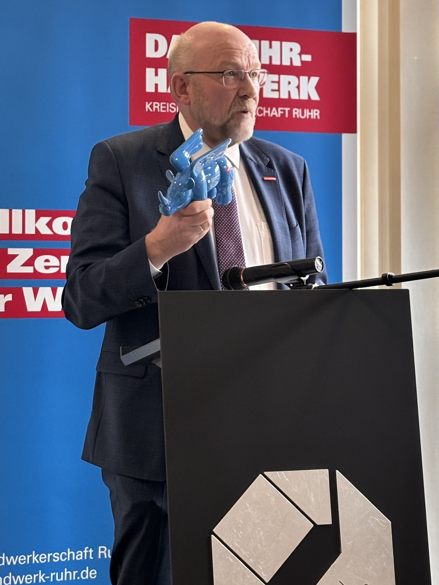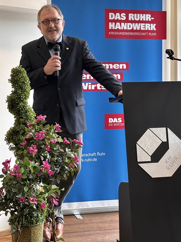 Die Laudatio auf den scheidenden Geschäftsführer hielt Ehrenkreishandwerksmeister Johann Philipps. „Heute schließt sich für mich ein Kreis - denn vor 30 Jahren durfte ich einen Mann einstellen, den wir heute in den Ruhestand verabschieden. Es ist mir daher eine sehr persönliche Freude und große Ehre, hier sprechen zu dürfen. Vom ersten Tag an war klar: Dieser Mann brennt für das Handwerk, mit Disziplin und Selbstbewusstsein, bis zum letzten Tag. Sein erstes Großprojekt war das Bildungszentrum, mit Architektenwettbewerb, Ausschreibungen bei einer Fördersumme von 40 Millionen DM und dem Bau ab dem Spätherbst 1999. Am 1. Oktober 2001 ging die Akademie in Betrieb. Es war eine intensive Zeit, aber schnell war klar: Das ist nicht das letzte große Projekt. Zum Jahreswechsel 2003/ 2004 folgte die Geschäftsstelle auf Springorum. Dazu der ganz normale Wahnsinn des Alltags: Sitzungen wurden vor- und nachbereitet, die Kammerarbeit, Arbeitsmarktprojekte und vieles mehr. Es gab keine Veranstaltung, bei der du gefehlt hast - Du warst immer präsent und 30 Jahre lang 24 Stunden am Tag für das Handwerk da - mit Verlässlichkeit, Loyalität und tiefem Verständnis für das Ehrenamt. Für dich war immer klar: Das Ehrenamt entscheidet und trägt unser Handwerk! Du warst der Motor im Hintergrund, der kompetent und ohne Verzögerung gearbeitet, zusammengeführt, ermöglicht, den Ehrenamtsträger den Rücken frei gehalten hat, damit sie ihre Arbeit machen können. Wenn ein Mensch so arbeitet, dann schafft er Vertrauen und bringt Sicherheit, die aus der Stabilität erwächst“, so Ehrenkreishandwerksmeister Johann Philipps.