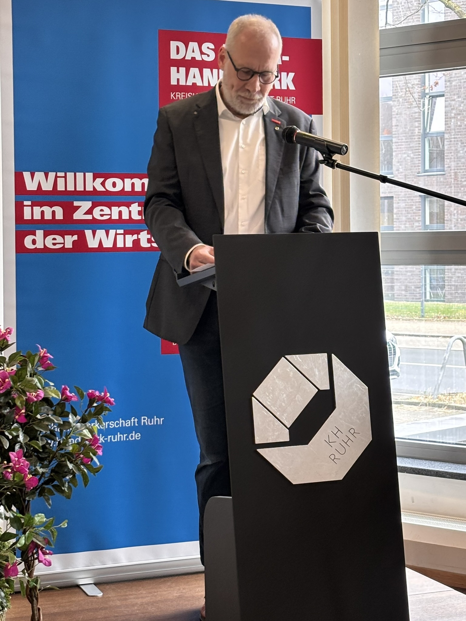 Drei Jahrzehnte hat Johannes Motz als Geschäftsführer die Geschicke der Kreishandwerkerschaft Ruhr und ihrer Innungen geprägt. Es waren bewegte, energiegeladene Jahre: mit Hunderten von Vorstandssitzungen und Innnungsversammlungen, zwei Fusionen, dem Bau der Akademie des Handwerks Ruhr und der KH-Geschäftsstelle im Innovation Springorum und vielem mehr. Am 31. Januar 2026, seinem letzten Arbeitstag, wurde Johannes Motz in den Ruhestand verabschiedet. Der Rahmen: ein familiäres Beisammensein mit den Ehrenamtsträgern "seiner" Innungen und Kreishandwerkerschaft, Mitarbeitenden, engen Wegbegleitern und der Familie - locker, aber mit viel Wertschätzung und Wir-Gefühl. 200 Gäste waren gekommen, um ihn mit stehenden Ovationen für sein außerordentliches Engagement zu verabschieden.