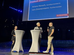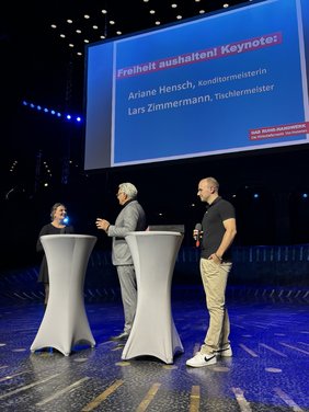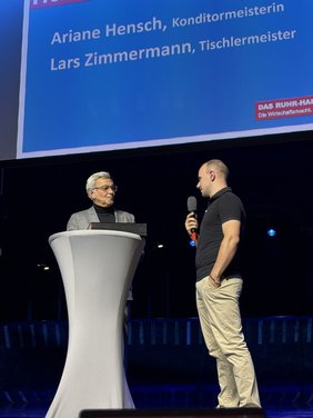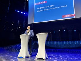Mehr als 600 Gäste, darunter viele Repräsentanten der Landes- und Kommunalpolitik, Wirtschaft, Verwaltung, Bildung, Krankenkassen und der berufsständischen Partnerorganisationen waren der Einladung der Kreishandwerkerschaft Ruhr gefolgt, unter ihnen der Präsident der Handwerkskammer Dortmund, Berthold Schröder, der ein Grußwort an die erfolgreichen Gesellinnen und Gesellen der Winter- und Sommerprüfungen und neuen Auszubildenden richtete sowie die Keynote Speaker Ariane Hensch (Konditormeisterin) und Lars Zimmermann (Tischlermeister).