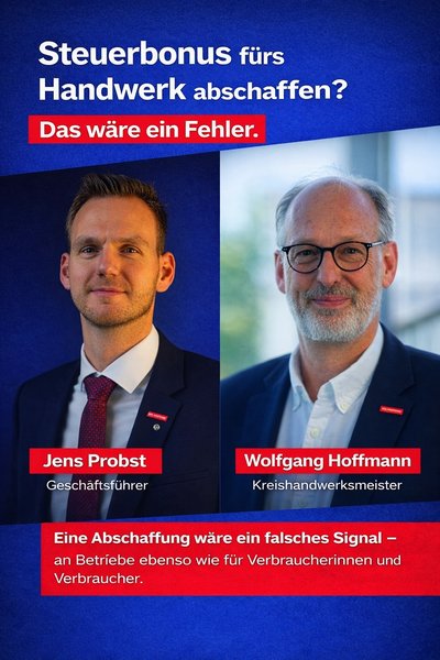 „Die Überlegungen zur Abschaffung des Steuerbonus für Handwerksleistungen gehen an der Realität im Handwerk vorbei. Was als ‚unwirksame Subvention‘ bezeichnet wird, ist in Wahrheit ein bewährter Anreiz für Verbraucherinnen und Verbraucher, Aufträge legal zu vergeben. Der Steuerbonus sorgt dafür, dass Arbeit offiziell beauftragt wird, Betriebe auslastet und Beschäftigung im regionalen Handwerk sichert. Gerade weil es sich um ein vergleichsweise einfaches und transparentes Instrument handelt, entfaltet es eine große Wirkung – direkt bei den Menschen.